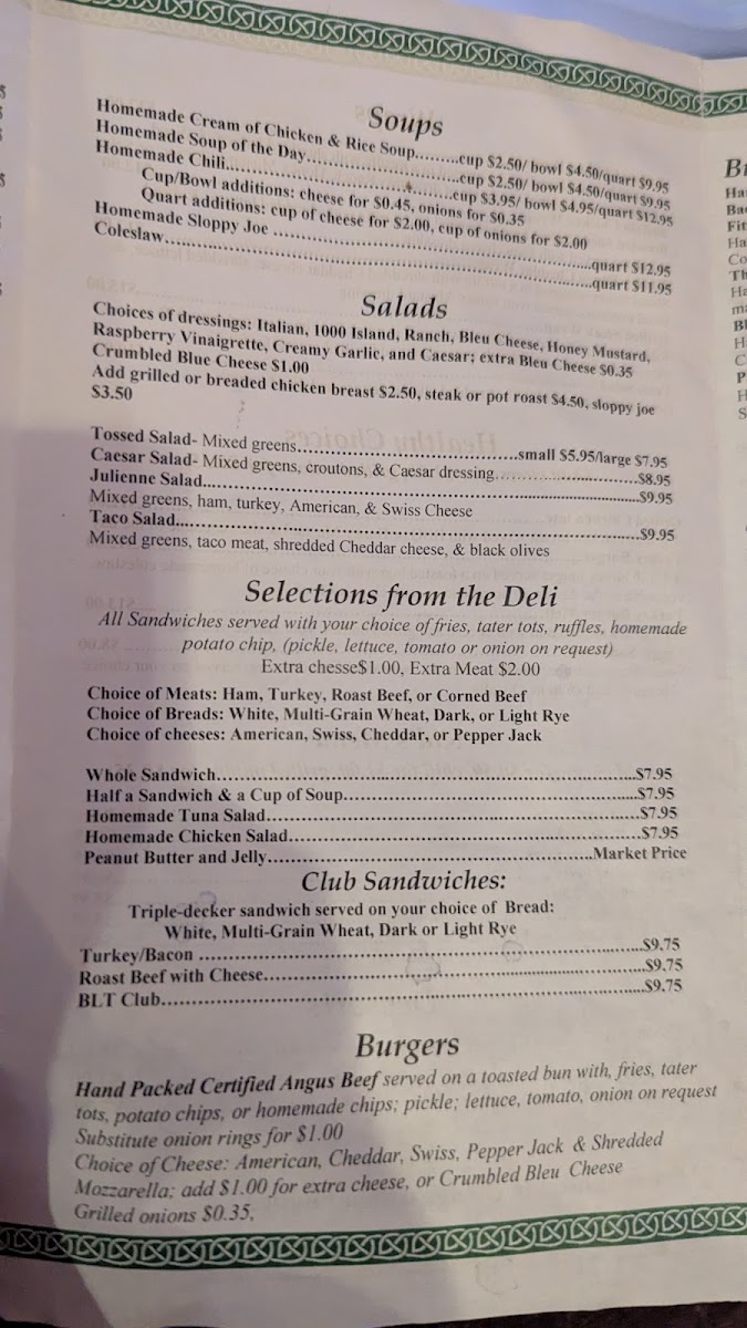- Variety of burgers and club sandwiches, from simple to fully loaded